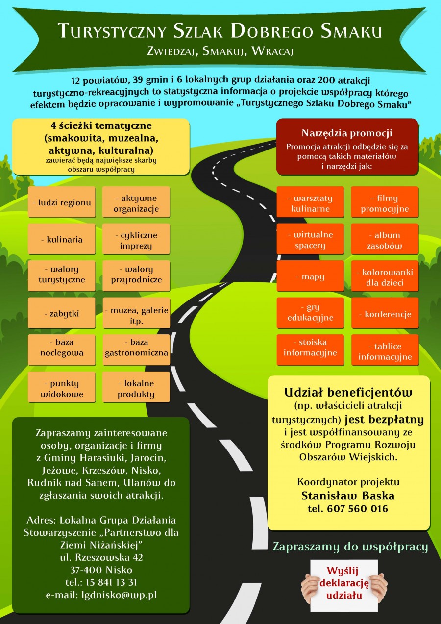 Lokalna Grupa Działania Stowarzyszenie „Partnerstwo dla Ziemi Niżańskiej” rozpoczyna wdrażanie projektu „Turystycznego Szlaku Dobrego Smaku, w ramach którego będzie wypromowanie 39 gmin z terenu północnej części województwa podkarpackiego.Promocja będzie obejmować 200 atrakcji turystyczno – rekreacyjnych. Atrakcje pogrupowane w 4 ścieżkach tematycznych (smakowita, muzealna, aktywna, kulturalna) zawierać będą największe skarby Północnego Podkarpacia prezentując: ludzi regionu, aktywne organizacje, kulinaria, cykliczne imprezy, walory przyrodnicze i turystyczne, zabytki, izby regionalne (muzea, galerie), bazę noclegową i gastronomiczną, punkty widokowe, lokalne produkty.